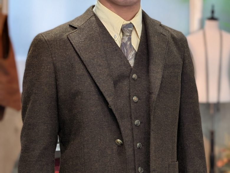 The vest, buttons, and tie all match