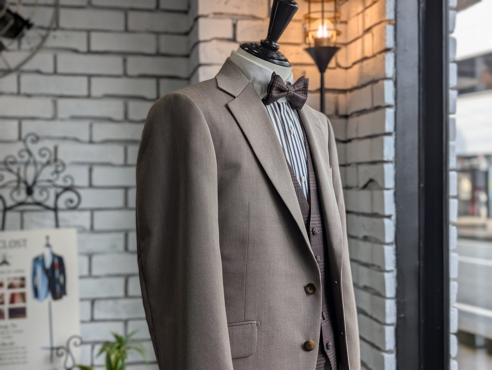 Beige suit with brown vest and tie