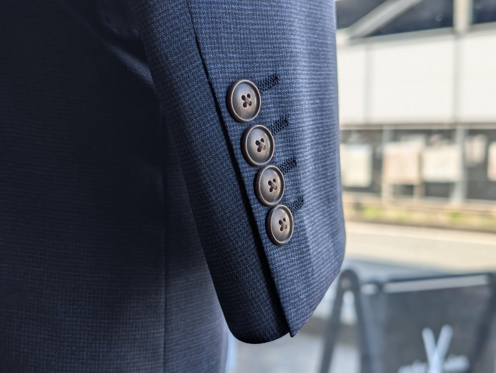 マイクロチェックのブルーグレースーツに茶系の釦。